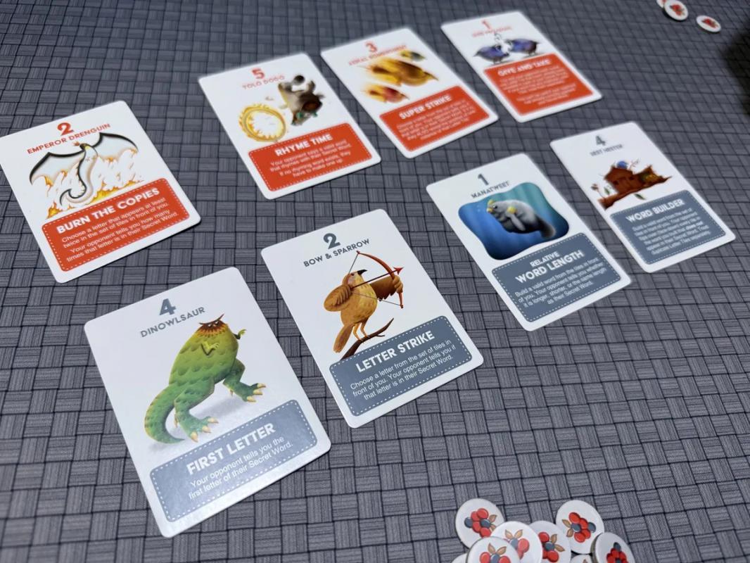 Write it down, keep it a secret. Rescramble your tiles, pass them to your opponent. The goal is to examine your opponent’s tiles and try to figure out their word. You do this with Clue Cards. These tell you things such as: what’s the first letter, how long’s the word, or what does it rhyme with? You win by using as FEW of these clue cards as possible to figure out what word your opponent wrote down.
