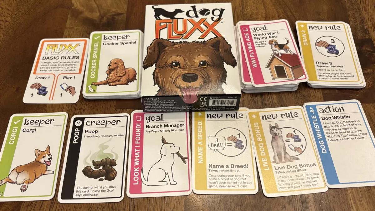 Dog Fluxx features canines and familiar Fluxx gameplay, with the game featuring eleven Dog breeds, The Human, a Fire Hydrant, new Actions such as "Bark At It Until It Goes Away" and "Did You Bring a Plastic Bag?", and new Rules such as "Live Dog Bonus" (which has you draw an extra card each turn while a dog is in the room).
