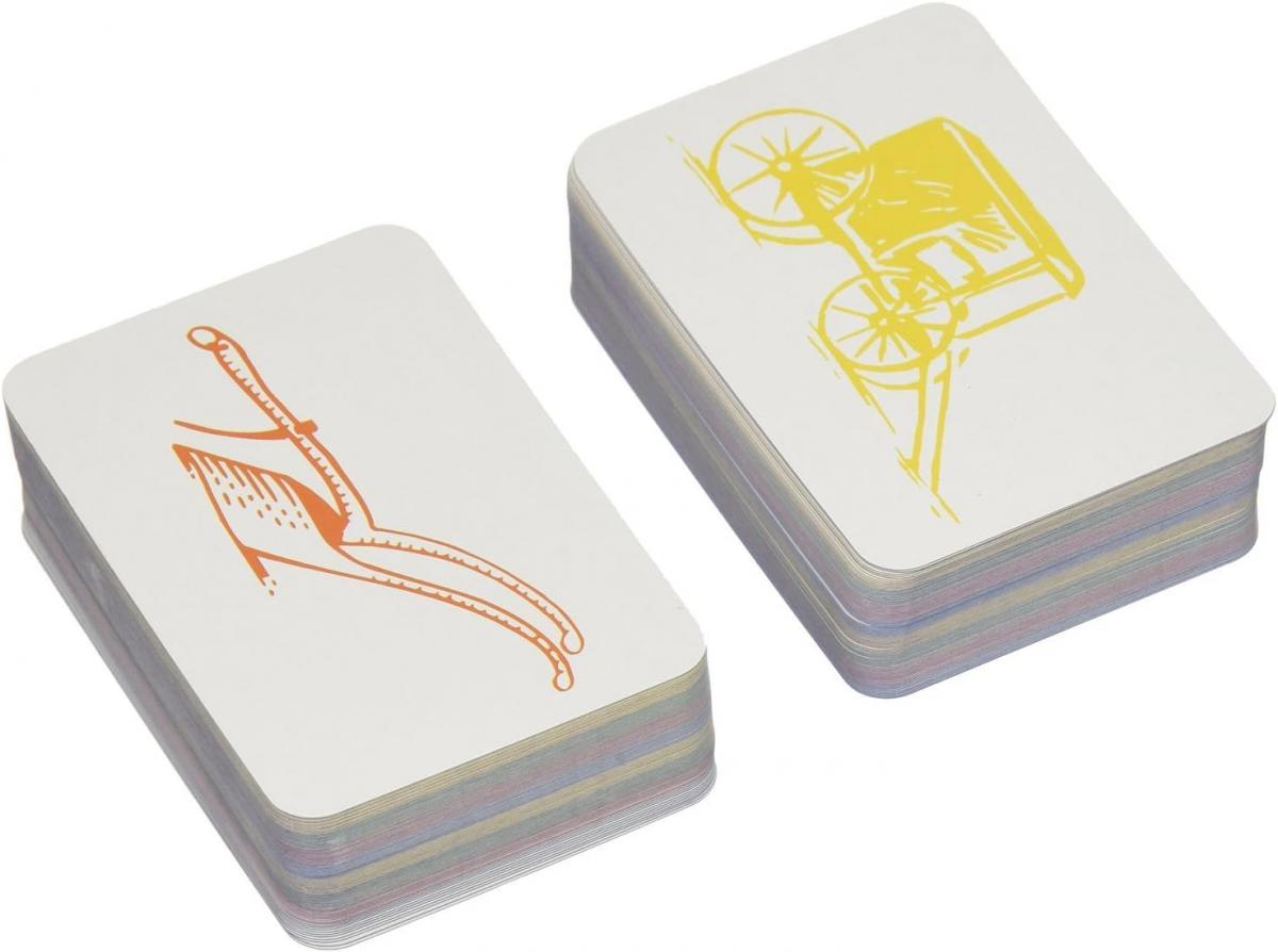 In Dutch Blitz, each player has her own deck of forty cards, with cards 1-10 in four colors; red and blue cards show a Pennsylvania Dutch boy, while yellow and green cards show a Pennsylvania Dutch girl. Each deck has a different symbol on the back to aid with card sorting between rounds.