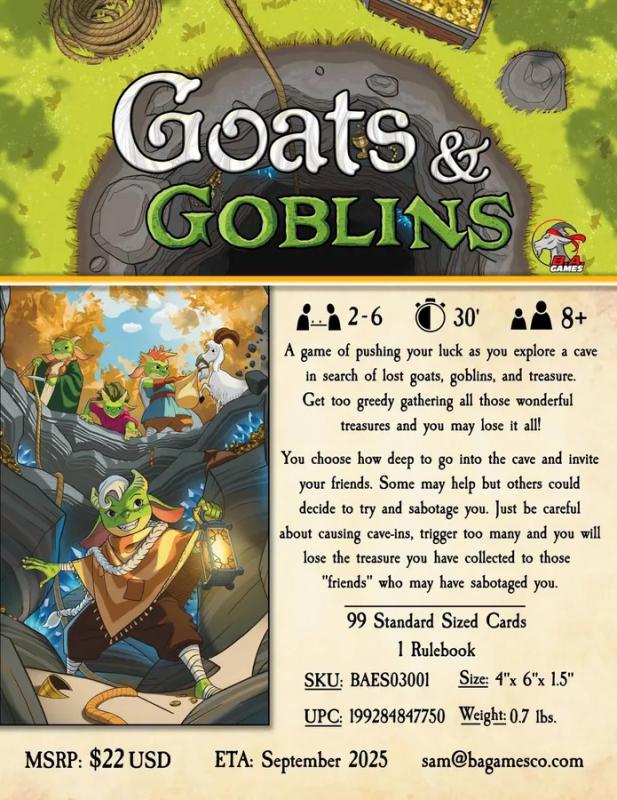 Those pesky goats have escaped again and are now bleating for your help from inside a treacherous cave! You and your fellow goblin herders must go down and retrieve them, but you soon spot mysterious gold, precious gems, and lovely trinkets in the shafts below. New plan: the goblin who can retrieve the most treasure from the risky depths wins! But be careful - going too deep may cause too many Cave-Ins and force you to drop your treasure as you flee, leaving it unguarded for the saboteurs to take.