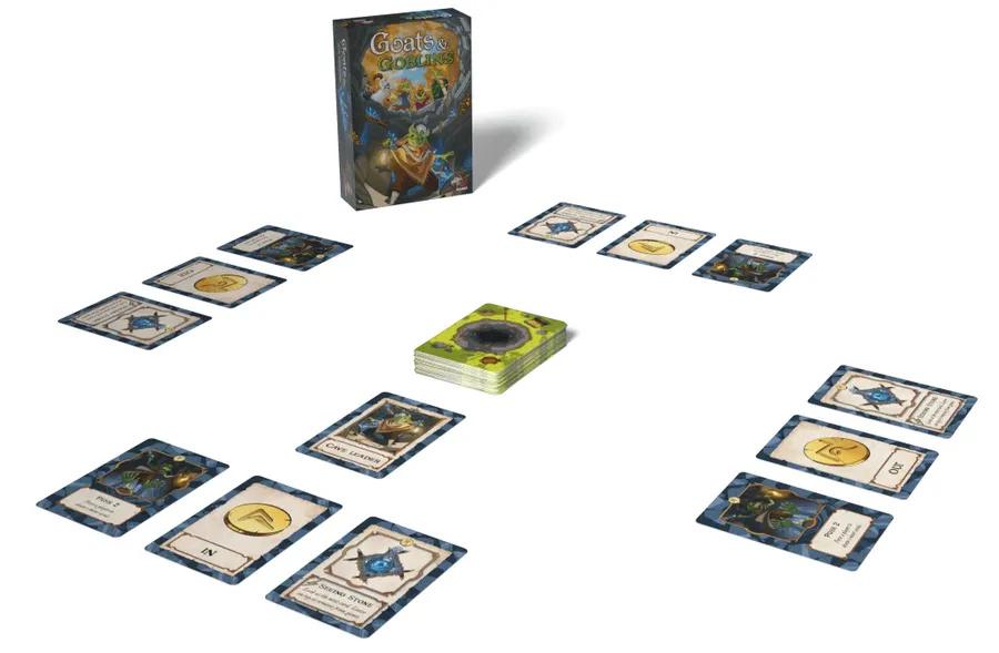 Goats and Goblins is a push-your-luck game where you will attempt to collect treasures, goats, and goblins from the mysterious cave before it collapses. You will take turns leading expeditions below the surface, inviting other players to join you or stay behind. If your mission is successful, the exploring members will gain valuable cards to divide. Failed expeditions will give cards to the players who did not explore the cave. Some cards can be played to support or hinder expeditions.