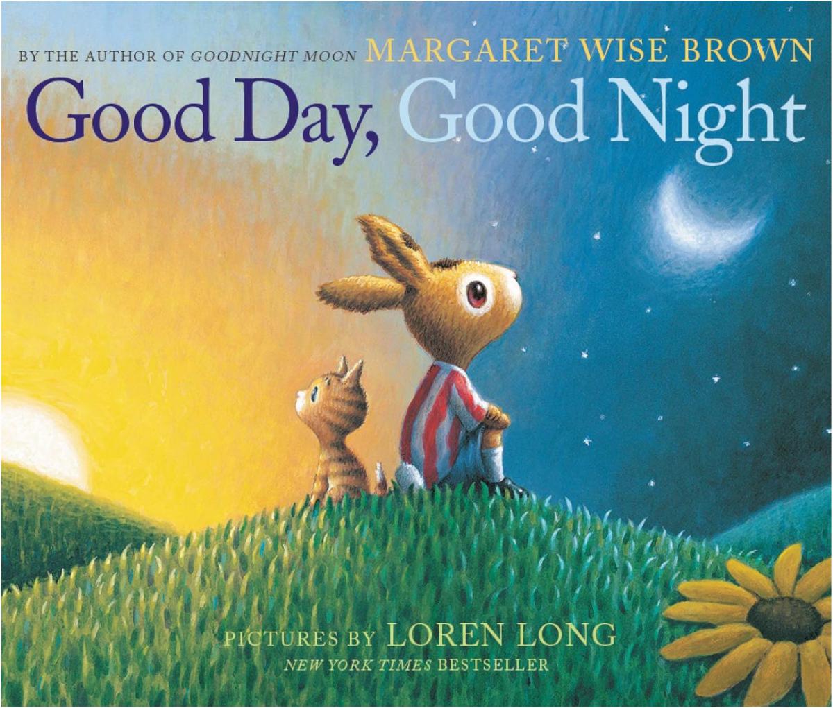 When the sun comes up and the day begins, the little bunny says good day to all the familiar things outside. To the birds in the skies and the bees in their hives, to everything one by one. And as the sun starts to set, it’s time for the little bunny to say goodnight. Goodnight, kitty. Goodnight, bear. Goodnight, people everywhere.