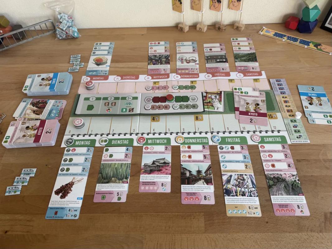 The game consists of thirteen rounds in which players draw activity cards illustrated by Japan-based artists and strategically place them in different days in their week-long itinerary. These can't-miss tourist attractions will have you bouncing between Tokyo and Kyoto as you try to puzzle out the optimal activities to maximize your experience while balancing your resources. The game ends with a final round in which you ultimately go on your planned trip, activating each of your cards in order along the way.