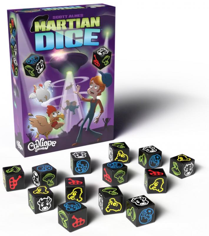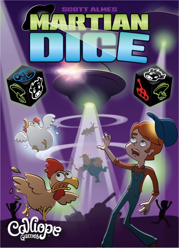 In Martian Dice, you roll thirteen custom dice in an effort to set aside ("abduct") humans, chickens, and cows. With each roll, you must first set aside any tanks, representing the human military coming to fend off your alien invasion, then you may choose one type of die to set aside as well — one type of earthlings to abduct, or death rays to combat the military. At the end of your turn, if you have at least as many death rays as tanks, then you may abduct the earthlings you've been setting aside. You can't pick any type of Earthling twice in one turn, but if you manage to abduct at least one of each, you'll score a bonus!