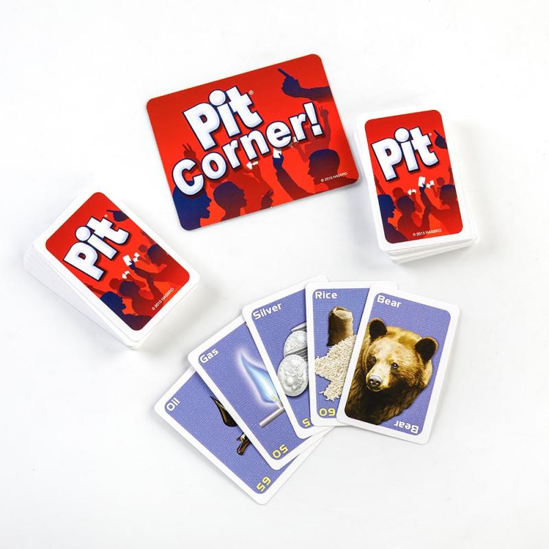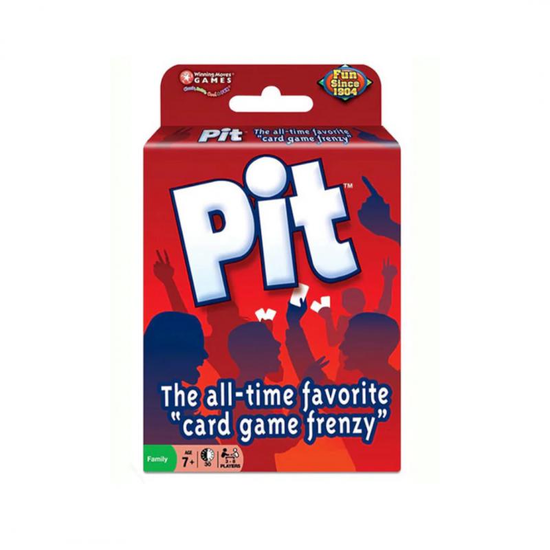 Pit is an open-outcry commodity trading game. The first edition in 1903 had a deck of 63 cards, 9 each of 7 commodities, each with a value (ranging from 40 for Flax to 100 for Wheat). Players offer trades by crying out the number of cards they want to swap (“One! One! One!”, or “Three! Three! Three!”) but not their identity. The winner of the hand is the first to collect all of one commodity, declaring “Corner on Wheat!” or whatever commodity has been collected. The winner of the hand scores points equal to the value of the commodity, and the winner of the game is the first to 500 points.
