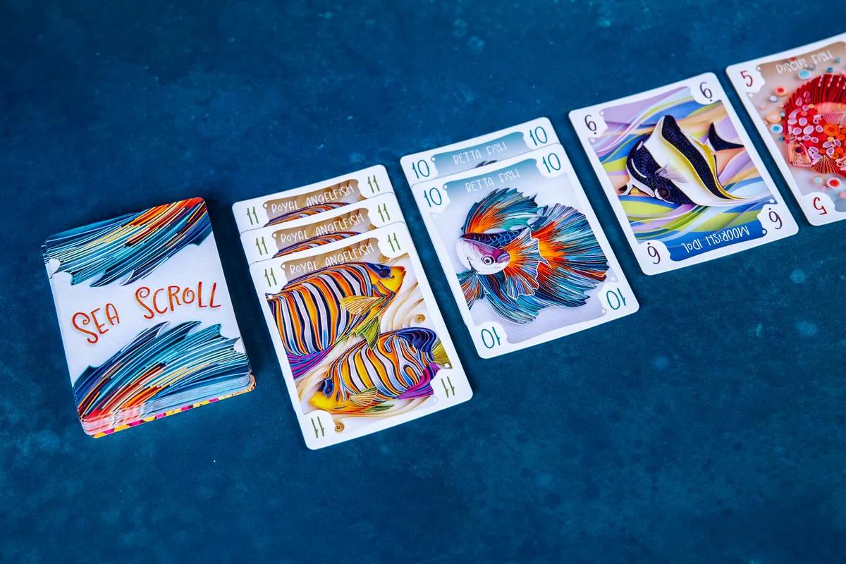 Sea Scroll is a quick-playing, deceptively strategic set collection card game where players will guide schools of fish from the Reef, or the central discard area, to their personal Habitat to form schools of fish, or card sets in front of them. At the end of the game, each player will combine their schools with fish cards remaining in their hands to score!