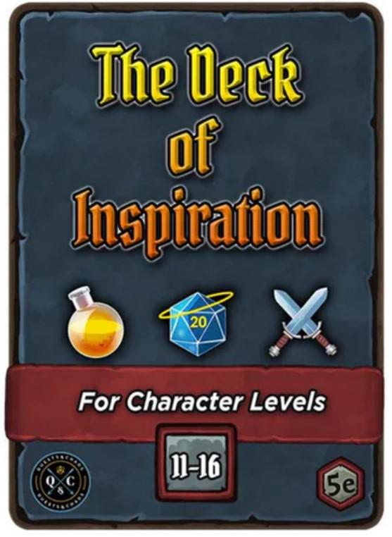 The Deck of Inspiration is designed to enhance the inspiration mechanic of Dungeons & Dragons 5e. The deck provides the DM with unique and fun one-time use boons to reward great player behavior. This deck contains 55 cards covering three types of boons, Divine Inspiration, Potions, and one-time use Magic Items. This deck is designed for character levels 11-16.