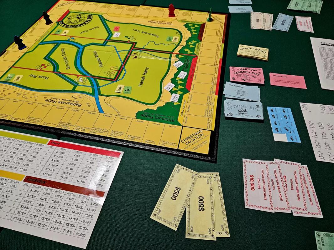 In The Farming Game, you develop your part-time farm by planting different crops (wheat, hay, cherries) and leasing additional cattle grazing rights, in the hopes that any given resource will pay out big so that you can afford to quit your day job and become a full-time farmer.