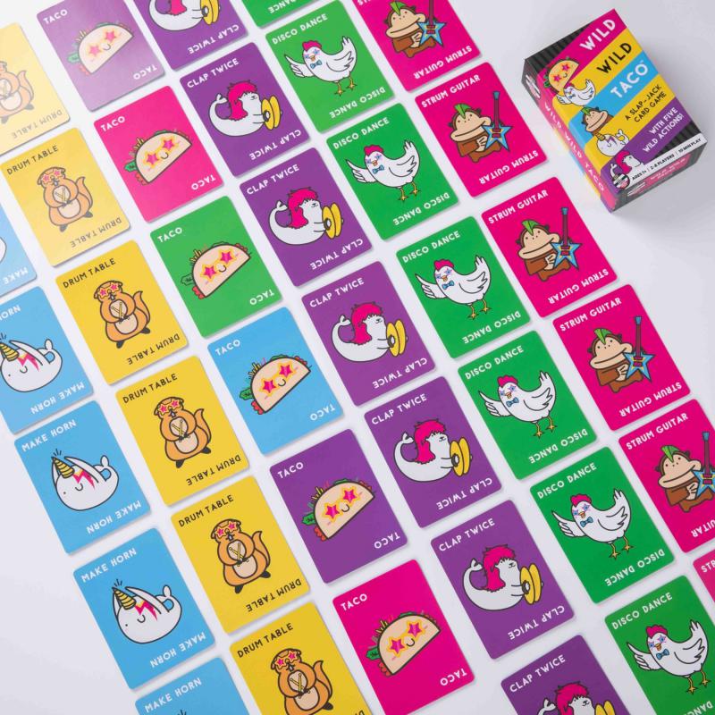 Players take turns flipping over their card while saying, Wild, Wild, Taco. When a card played matches the one before it, everyone does the corresponding action and races to slap the pile. The first to get rid of all their cards wins!