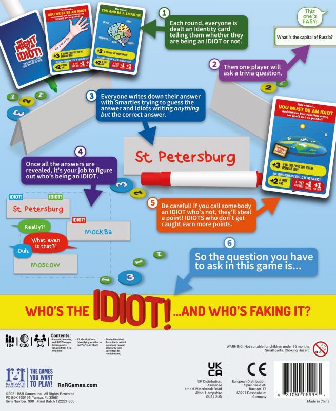 Clever trivia game with a twist. Each round, a rotating "genius" chooses a question for the other players to answer. One or more of those players might be randomly (and secretly) designated as "idiots", in which case they must write an incorrect answer. There are several ways to score points: get the answer right when you're not an idiot; correctly accuse an idiot; avoid getting found out when you're an idiot; or trick others into accusing you when you're not an idiot. These scoring dynamics lead to plenty of interesting decisions, making this much more interesting and tactical than your average trivia game.